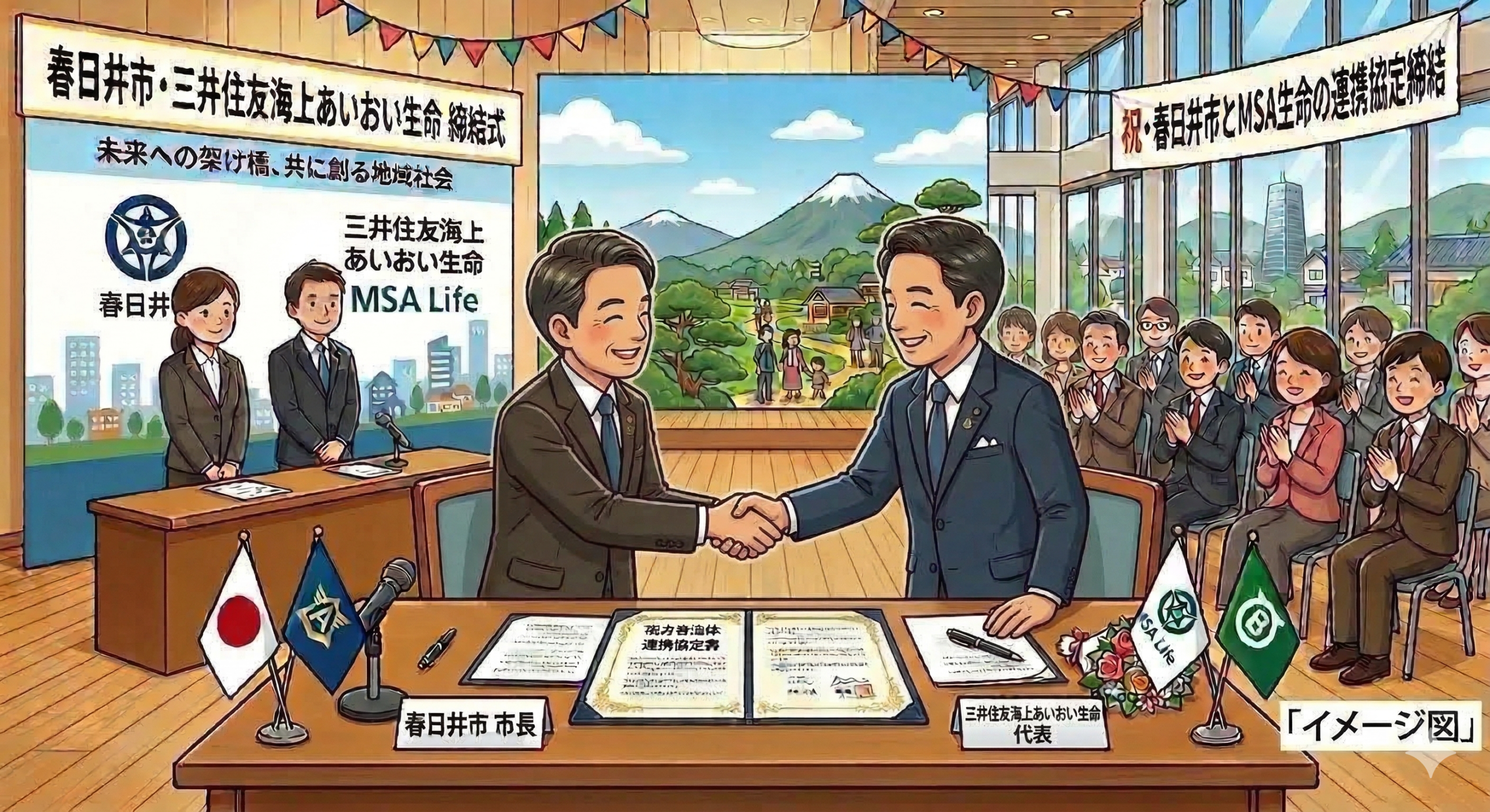 弊社取り扱いの三井住友海上あいおい生命社と春日井市が連携協定の締結を結びました。